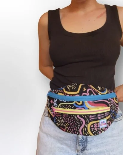 Carry a piece of art wherever you go with this handmade bum bag, crafted using this bold screen-printed pink fabric from Injalak Arts in Gunbalanya, in Australia’s Northern Territory.